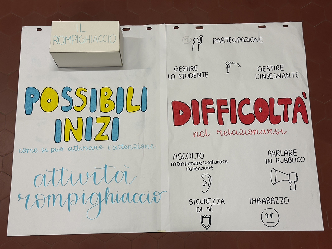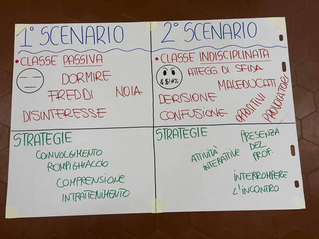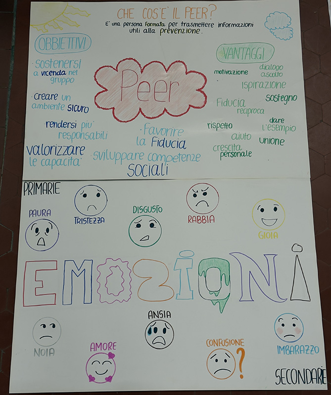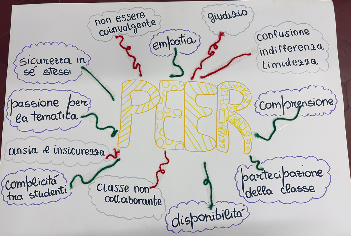 Poi il pensiero si è spostato dall’interno all’esterno, dalla riflessione all’azione. Che cosa succede quando un Peer entra in una classe? Come si parla, come si ascolta, cosa si fa quando qualcuno provoca, quando qualcuno si annoia, quando qualcuno invece ha voglia di esserci? Attraverso un gioco di ruolo, i ragazzi hanno abitato questi personaggi, scoprendo che cambiare punto di vista cambia anche il modo di stare nello spazio e nelle relazioni. Anche in questo caso il lavoro si è tradotto in un prodotto concreto: cartelloni che raccolgono le difficoltà incontrate, le emozioni emerse, le fragilità riconosciute, ma anche le strategie immaginate per affrontarle e le opportunità che queste stesse situazioni possono offrire.